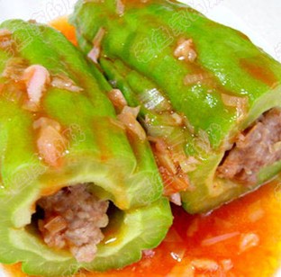 原料: 苦瓜一根,肉末。 配料: 番茄醬、辣椒粉、白糖、蒜末。 做法: 1、肉末加鹽、辣椒粉、水淀粉腌制五分鐘。 2、苦瓜一切為二,去瓜瓢,把腌制好的肉末填進(jìn)去。 3、把苦瓜放到玻璃盆里,蓋上蓋子,入微波爐蒸五分鐘。 4、蒸苦瓜的同時,鍋里放底油,蒜末熗鍋,然后倒入番茄醬,加少許水化開,加一點(diǎn)白糖調(diào)味,最后把調(diào)味汁直接淋到蒸好的苦瓜上即可。 特點(diǎn):用微波爐蒸的苦瓜,能很好的保持苦瓜的青翠,顏色特別漂亮。 |