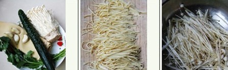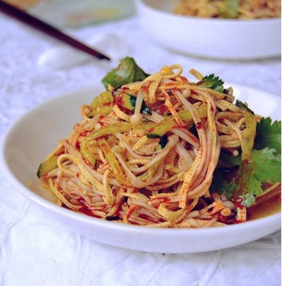 原料:豆腐皮、金針菇、黃瓜、香菜、蒜。