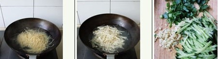 3、黃瓜切絲、大蒜剁成碎末、香菜切斷備用;