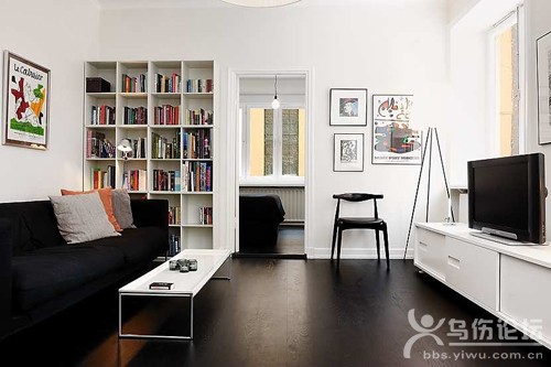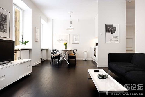 | 47平方?其實(shí)我自己都不敢相信!!不知道是不是照片角度問(wèn)題還是咋的,感覺這空間非常之大……,但看了一下基本信息,卻顯示著面積約47平方米。!整個(gè)空間是長(zhǎng)方形的,個(gè)人來(lái)說(shuō),真的不太喜歡長(zhǎng)方形的設(shè)計(jì),但這房子的設(shè)計(jì)卻是非常給力,讓人都不感覺到長(zhǎng)形的不方便,分為一房一廳,臥室并不大,只是大概幾平方的空間吧,剛才放置床鋪以及衣柜等收納柜……一走進(jìn)來(lái),玄關(guān)處不大,可以放外套掛物和一些雜物,進(jìn)入后,雖然還都是開放式的,但把客廳和廚房一分為二,分開了,空間就一下子覺得舒暢了很多。設(shè)計(jì)是以黑白為主,又點(diǎn)男性化的感覺,黑白分明,突出個(gè)性,爽朗大方,沒有太多余的擺飾,只是白色的墻上避免空洞掛了一些簡(jiǎn)單的畫。 |