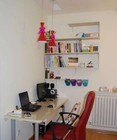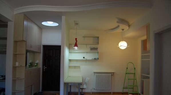 雙人書桌,造型書架、餐邊柜、餐桌隔板. 喜歡長長的雙人書桌.和好多同學(xué)們的家里一樣,老公老婆人手一機(jī),一個(gè)臺(tái)式機(jī),一個(gè)筆記本。(哈哈,不知道大家有沒有發(fā)現(xiàn),我們家沒有電視吔,我們已經(jīng)不看電視兩年半了,電視柜現(xiàn)在用來放綠植了,明年家人要過來的時(shí)候再給他們買電視吧)所以我一定要設(shè)計(jì)一個(gè)雙人書桌,這也是我們每天使用時(shí)間最長的地方。 以前出租房的時(shí)候,電腦都放房間里,每次都在房間用電腦,嚴(yán)重影響了我的睡眠,所以我堅(jiān)決反對(duì)在新房子里把電腦安排到臥室,即使是次臥也不行。睡覺的地方一定要遠(yuǎn)離家電。經(jīng)過幾個(gè)方案比較,最終確定了,在玄關(guān)入口處加一個(gè)隔斷墻,在餐廳的位置勻出來一部分空間作為電腦間,挨著隔斷墻防止了一個(gè)1.6長的電腦桌,給臺(tái)式機(jī)配一個(gè)鍵盤托,給筆記本下方配一個(gè)大抽屜,在加上四條腿,這樣我門心愛的電腦桌就出爐了呢。 硬裝后搬家前照片