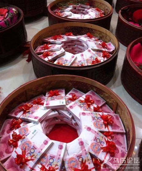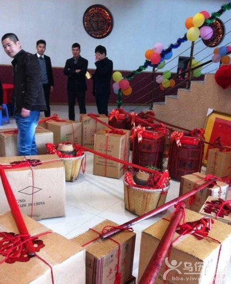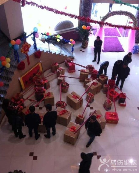 十八個壯漢挑著擔(dān)子,擔(dān)子兩頭的竹籃里一共放著8888888元現(xiàn)金。 他們后面跟著瑪莎拉蒂、奔馳等10輛豪車。 昨天,在浦江一點紅大道出現(xiàn)的豪華定親隊伍,被網(wǎng)友拍下照片發(fā)到網(wǎng)上,不少網(wǎng)友開玩笑說,“土豪,我們做朋友吧”。 竹籃里裝了888萬現(xiàn)金 昨天上午10點多,浦江微博網(wǎng)友“可樂80888”經(jīng)過一點紅大道牧童集團附近,發(fā)現(xiàn)一支豪華車隊在路上慢慢行駛,打頭的是一輛瑪莎拉蒂,后面清一色的奔馳S級轎車。車隊前面的,走著五六十個人,而最前面的18個壯漢則挑著擔(dān)子。 一看這架勢,“可樂80888”就知道遇到大戶人家定親了,趕緊過去湊熱鬧,跟著定親隊伍走進一家工貿(mào)公司辦公樓的大廳里。 等擔(dān)子被放下時,“可樂80888”徹底驚呆了,竹籃子里裝著嶄新的百元大鈔,還有首飾、服裝、日用品等。 “我在浦江見過定親最多挑168萬元現(xiàn)金的!薄翱蓸80888”打聽了一下,確認(rèn)現(xiàn)場現(xiàn)金是8888888元,被驚到的他趕緊拍照,發(fā)微博、發(fā)微信,很快,“浦江土豪定親彩禮高達888萬”就成為網(wǎng)絡(luò)熱門話題。 女方低調(diào)辦了11桌 昨天中午12點,記者趕到定親現(xiàn)場,公司大樓前后停滿車子,定親宴在辦公樓的大廳舉行。我數(shù)了數(shù),只有11桌,女方家屬說,他們想低調(diào)點,所以只請了親人,也沒在酒店擺。 聽到有記者來采訪,定親雙方不愿多說,給記者發(fā)了喜糖。 在訂婚宴上,準(zhǔn)新郎新娘都很低調(diào),準(zhǔn)新郎個子不高,戴著眼鏡,留著短發(fā),看起來很內(nèi)向,準(zhǔn)新娘看起來外向得多,幫著家里人給客人們發(fā)喜糖。 女方的一位親屬透露,男方是義烏人,姓黃,27歲,父親以前是做建筑生意的,家底殷實,在義烏市區(qū)有十多棟樓。 準(zhǔn)新娘也姓黃,26歲,家里也做生意,除了家紡和毛絨玩具,還有其他的投資,算是門當(dāng)戶對。 準(zhǔn)新郎是準(zhǔn)新娘哥哥的朋友,三個月前,通過朋友認(rèn)識,覺得準(zhǔn)新郎人不錯,想到自己還有個未嫁的妹妹,哥哥就當(dāng)了中間人,沒想到兩個人一見如故,很快就走到了一起。 兩人在一起兩個多月,準(zhǔn)新郎父母主動提定親,兩家人坐在一起沒商量多久就定下來。原本男方準(zhǔn)備的彩禮是500萬元現(xiàn)金,但女方覺得不如6、8來得好聽,最終把彩禮定在8888888元。 我算了一下,嶄新的百元人民幣每張大約1.15克,一萬元就是115克,不算8888元零頭,光888萬的現(xiàn)金就重102.12公斤,至少要兩個人才能背得動。 現(xiàn)金提前半個月取好了 為了昨天的定親,男方半個月前就開始準(zhǔn)備了,尤其是彩禮,為了取到的錢全部是新幣,早早地就到銀行預(yù)約,女方哥哥還幫忙到中國銀行取了200萬元的現(xiàn)金。 “錢放在家里的保險箱,沒特殊保護,反正沒人知道。”準(zhǔn)新娘哥哥透露。 昨天上午10點20分,定親雙方在一點紅大道牧童集團門口附近迎親,男方按照義烏的民俗,把定金放在竹籃里,十八個狀漢挑著十八擔(dān)禮物和現(xiàn)金往準(zhǔn)新娘家的公司走,定親車輛則跟在后面。 從牧童集團到準(zhǔn)新娘家公司全程1.5公里,天下著毛毛雨,路滑,再加上每個擔(dān)子上彩禮又不輕,五六十號人組成的定親隊伍足足走了20分鐘。 這么多現(xiàn)金,萬一被搶了怎么辦? 準(zhǔn)新娘哥哥說,在浦江,定親彩禮一般都在幾十萬元以上,一兩百萬元也很平常,再說這么多人陪著,誰也不敢貿(mào)然去打主意的!拔覀儗Σ识Y單簡單核實后,為了安全著想,就讓會計把錢存到銀行去了! 按照當(dāng)?shù)仫L(fēng)俗,男方定親的彩禮,并不是真的收了,到結(jié)婚時不僅要還回去,還要置辦一些嫁妝帶過去。 “十八擔(dān)”是最高訂婚規(guī)格 “十八擔(dān)”是義烏傳統(tǒng)民俗中最豪華最利市的一種喜事級別。 訂婚的當(dāng)天,男方家長要邀請自家的親朋好友,帶上精心準(zhǔn)備的禮物在媒人的引領(lǐng)下,由舅舅帶隊前往女方家里送禮訂婚。 “十八擔(dān)”里面裝著現(xiàn)金、金銀首飾、酒水、日用品等。以往酒水和日用品占的比例大得多,這些年隨著經(jīng)濟的發(fā)展,擔(dān)子里的現(xiàn)金越來越多,在義烏7位數(shù)的彩禮司空見慣。 迎接男方送禮對物時,女方要在家門幾百米外安排親朋好友迎接,人數(shù)不僅要和男方送禮的人數(shù)一樣,身份也要相當(dāng)。女方家長收到禮單后,雙方還要交換“年庚帖”,為的是日后作為結(jié)婚的憑證。宴請結(jié)束后,女方要準(zhǔn)備回禮,讓自家親朋好友再挑上擔(dān)子,送出幾百米,才算是訂婚結(jié)束。 |