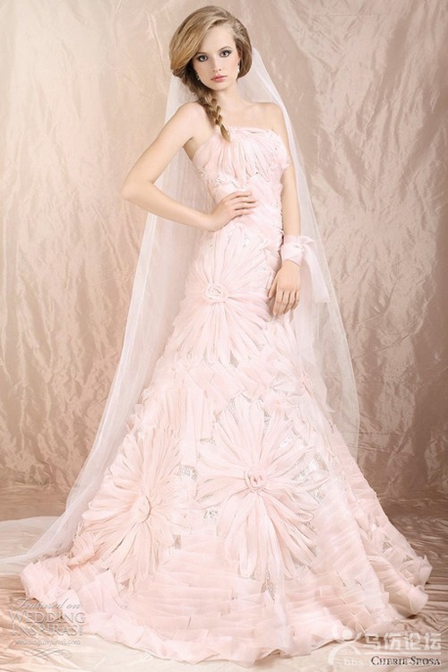 華麗麗的婚紗沒有新娘有足夠的勇氣說不,看多了潔白婚紗,一件意味著浪漫純潔的粉色婚紗,新娘們一定很眼紅吧?花瓣式抹胸,柔順的中擺婚紗,一朵朵綻放更盛的花朵吸附在婚紗上。夢幻的粉色頭紗以及腕紗,真的,很美。