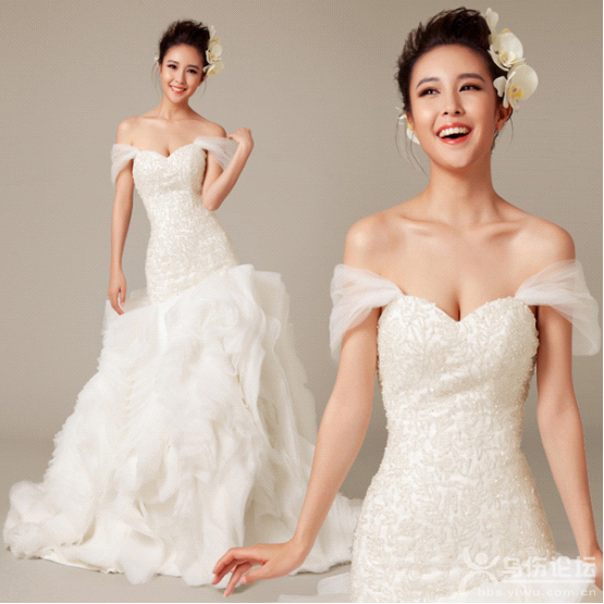 美麗新娘婚紗 一生僅一次的信仰 這是一款褶皺魚尾新娘婚紗,紗紗的肩帶既可一字肩也可做吊帶,而且效果不同:穿做一字肩會(huì)更加突顯嫵媚氣質(zhì),而做吊帶穿則為新娘增添幾分俏皮與活潑感。而新娘婚紗下擺采用了非常夢(mèng)幻的褶皺設(shè)計(jì),帶有VeraWang的風(fēng)情,與魚尾剪裁搭配起來(lái)非常有范兒! |