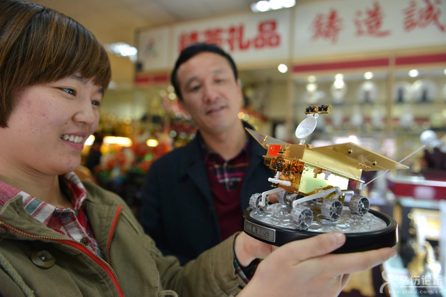 12月3日下午,浙江省義烏國際商貿(mào)城1期市場精薈工藝品有限公司商鋪內(nèi),標(biāo)有“嫦娥三號(hào)”標(biāo)志的月球車模型成了最近幾天成了義烏市場最耀眼的“明星”。從嫦娥三號(hào)12月2日凌晨成功發(fā)射!啊裢谩(hào)月球車”尚未飛到月球,卻先飛到了義烏市場——— 嫦娥三號(hào)剛剛上天 7 個(gè)小時(shí),它的 1 : 12 比例模型就出現(xiàn)在了義烏國際商貿(mào)城的貨架上。從2日到3日,短短兩天共售出了千余件。 據(jù)該公司市場部經(jīng)理葉明介紹,公司第一時(shí)間獲悉“嫦娥三號(hào)奔月”的消息。通過多輪競爭拿到探月與航天工程中心授權(quán)生產(chǎn)‘玉兔’月球車模型。之后他們與深圳一家企業(yè)進(jìn)行了聯(lián)合研發(fā)、創(chuàng)意設(shè)計(jì),原樣復(fù)制。10月28日,生產(chǎn)出了第一個(gè)模型,之后進(jìn)行完善改進(jìn),得到對(duì)方認(rèn)可。作為全球單體面積最大的實(shí)體市場,今日義烏國際商貿(mào)城, 無論是制造、銷售,還是研發(fā)、展示,走出了“義烏速度”之路。 |