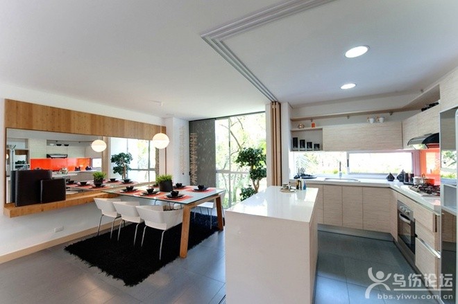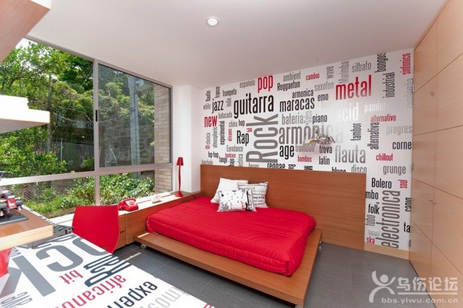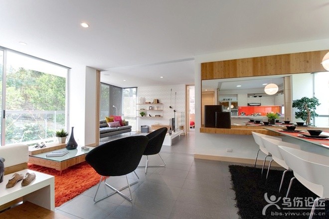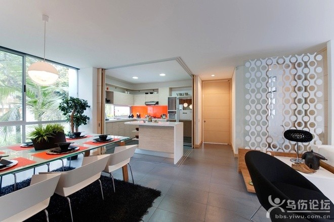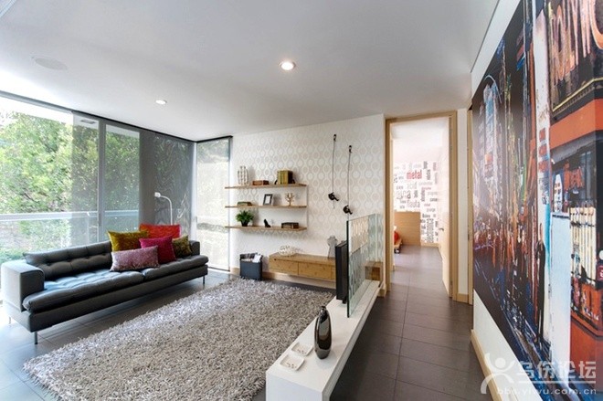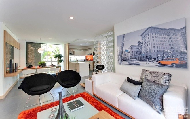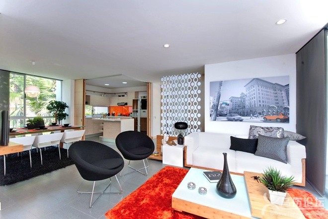 | 這套由毛洛佩斯設(shè)計,充滿大膽布局和豐富多彩的公寓,利用色彩、墻貼花和圖形藝術(shù)等,創(chuàng)造出一個充滿活力的生活空間。這種特殊的方法提供了為房間提供了快速換裝的可能性,并且無需投入太多時間,麻煩或費用。一個十分寬敞的開放式客廳作為房子的核心,提供了新鮮的氣氛。正是在這里,設(shè)計師投入的努力打造出了令人難忘的空間,整體散發(fā)著個性的設(shè)計元素。黑色和白色被用作背景,為時尚裝飾提供了基調(diào)。華而不實的橙色地毯和廚房擋水都在視覺上為空間進(jìn)行了補(bǔ)充,為整體方案提供了一個意想不到的轉(zhuǎn)折。每一個室內(nèi)墻貼花(包括浴室中)為房屋增添了連續(xù)性,更不僅僅依靠其獨特性。 |