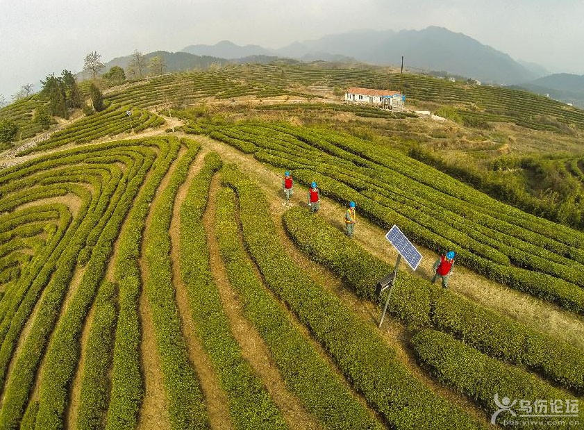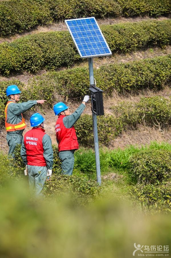 黨員服務隊隊員在茶葉生產基地檢查除蟲設備的線路