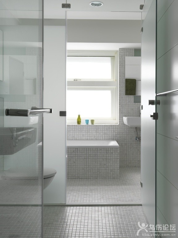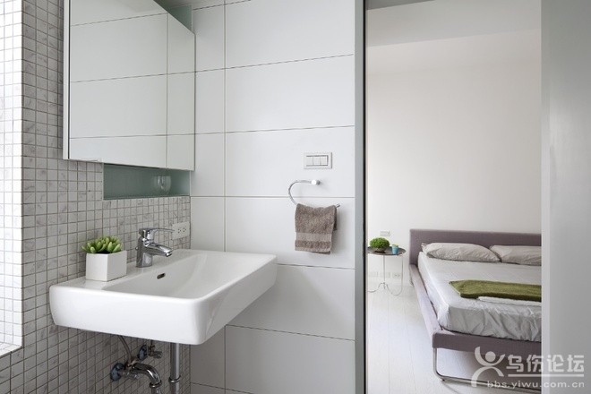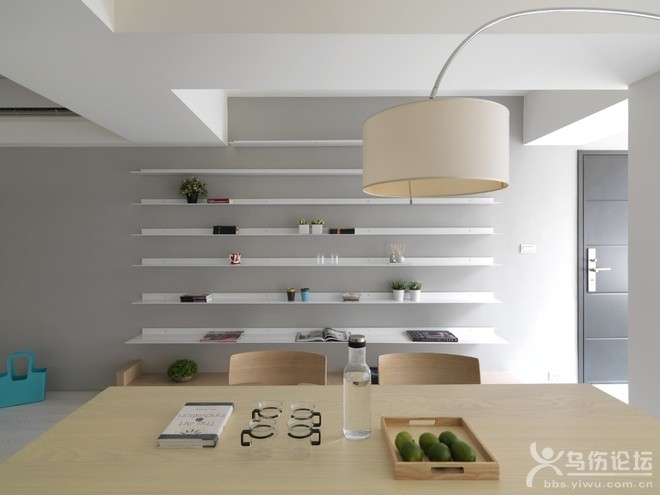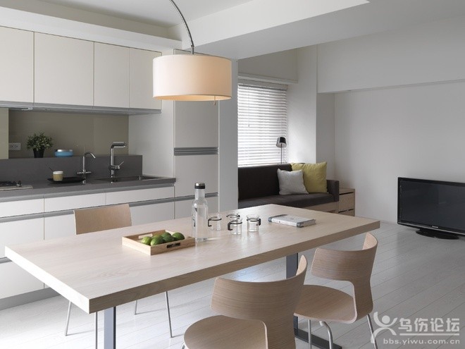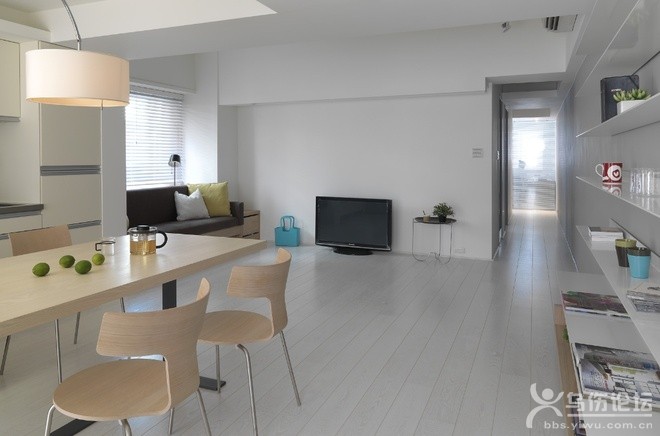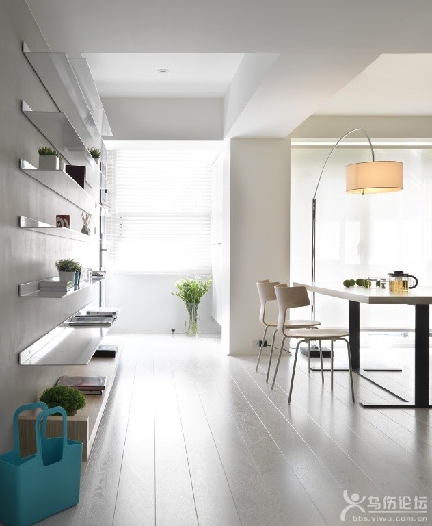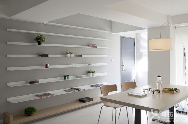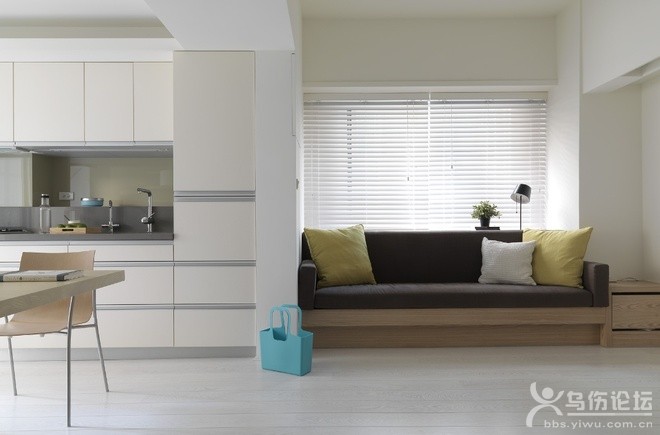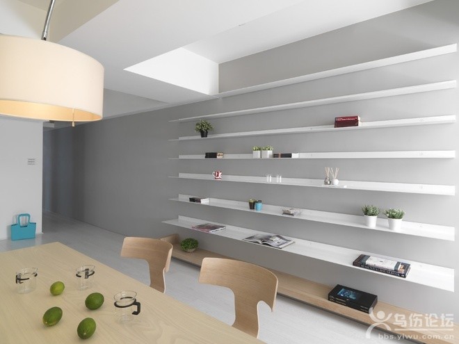| 要如何將小平米數(shù)空間發(fā)揮最大效益,對(duì)許多設(shè)計(jì)師來(lái)說(shuō)是最有趣的挑戰(zhàn),禾筑設(shè)計(jì)在此桉就精巧的拿?了比例,滿足了業(yè)主對(duì)于住家與辦公的雙重需求。二十年老屋除了房型狹長(zhǎng),還有常見(jiàn)樑柱量體龐大的問(wèn)題,且樑下僅二米一的高度,為了放大空間視覺(jué)效果,以全白做為空間主色調(diào),并讓光線儘量穿透整體空間,地板也選擇常用于鄉(xiāng)村風(fēng)空間的白色超耐磨木地板。平整俐落的線條釋放出最大的空間,充分利用公共區(qū)域,讓餐廳的大餐桌同時(shí)也是晤談、接待的地方,簡(jiǎn)單的構(gòu)思卻展開(kāi)更多的空間機(jī)能。設(shè)計(jì)師利用柱體間的空間作為主衛(wèi)浴,并與客衛(wèi)浴相通,改以玻璃噴紗門(mén)相隔,不但能引入窗外光源,更呼應(yīng)空間多元的場(chǎng)域轉(zhuǎn)化。 |