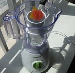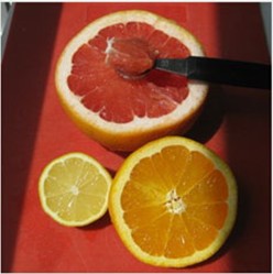 1、將鮮橙、西柚、檸檬洗凈擦干水分,分別切成兩半,用挖勺挖出果肉,檸檬用1/2
