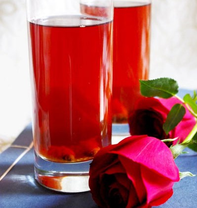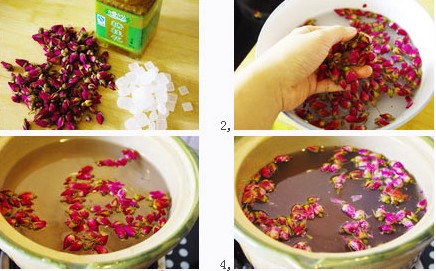 原料:干玫瑰花20G、冰糖按喜歡的口味酌量添加、糖桂花1湯匙。 做法: 1、將玫瑰花瓣輕輕搓洗,然后在砂鍋里注滿清水。 2、先把一半的玫瑰花瓣倒進沙鍋,蓋上蓋子用小火慢慢熬煮10分鐘左右。 3、打開鍋蓋,看到湯汁呈一種類似深藍鋼筆水的顏色,而玫瑰花瓣的顏色變成淺白,就可以把將鍋里的花瓣撈出來,然后再把另一半玫瑰花瓣放入鍋中繼續(xù)熬煮。 4、鍋開以后,根據(jù)個人口味加入適量冰糖,蓋上鍋蓋,還是用小火煮。 5、直至,鍋里的湯汁是深紅色,玫瑰花瓣的顏色變淺白,閉火,放涼,調(diào)入桂花糖即可飲用。