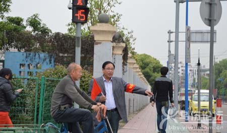 : 市教育局認真組織社區(qū)共建活動,去年以來,機關(guān)和直屬單位工作人員輪流在學院路開展路段巡查,圖為4月23日,教育研修院教師在勸導過馬路的行人和非機動車主。