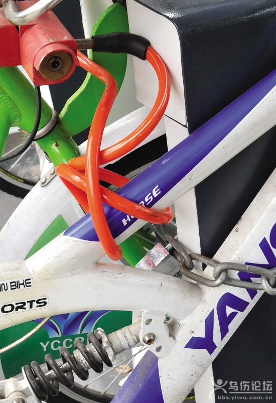 前幾日,義烏國際商貿(mào)城四區(qū)門口,在公共自行車站點(diǎn)停著一輛私人自行車。記者仔細(xì)一看,這輛藍(lán)色的自行車上有兩把鎖,坐墊上夾著一張紙條,上面寫著:自行車車主你好,你的自行車鎖在這里已一個(gè)星期,取車請(qǐng)向城建資源公司聯(lián)系。一名龔姓保安告訴記者,前兩天工作人員給它加了一把鎖。