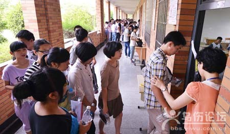 考生們經(jīng)過嚴(yán)格的安檢進入考場。