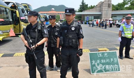 義烏中學(xué)考點外,市公安局巡特警大隊全副武裝的持槍特警站在通道口全程護考。