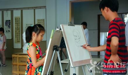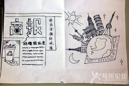 賓王中學學生鄭正雄的現(xiàn)場畫作,“商報攬盡天下事”形象地躍然紙上 看著擺在眼前的這首道情,賓王中學初二學生鄭正雄凝神思考不到三分鐘就開始拿起筆;稠州中學初二學生駱雯,拿著鉛筆在小詩上勾勾畫畫,不多時,也開始在白紙上畫起了線條……6月26日上午,記者在稠州中學科技樓的美術(shù)活動教室內(nèi)看到,30多位來自全市各中學的初中生,正在這里進行一場別開生面的繪本活動,為2014年浙江省藝術(shù)節(jié)做培訓準備。 引人注目的是,此次繪本活動的指導老師,除了中學美術(shù)老師之外,還有五位來自中國美術(shù)學院的年輕畫家。當學院派畫家遇到思維天馬行空的孩子時,會碰撞出怎樣的藝術(shù)火花呢? 要說這30多位初中生,來頭可不簡單。據(jù)稠州中學美術(shù)老師陳凌嬌介紹,這些孩子是2014年義烏市第19屆中學生現(xiàn)場美術(shù)比賽的一等獎獲得者,他們的繪本作品,有的甚至已經(jīng)出版,并有著不錯的銷售成績。 王冠山是2014年中國美術(shù)學院畢業(yè)展金獎獲得者。他告訴記者,這次他與獲畢業(yè)展金獎、銀獎的四位同學一道來到稠州中學參加這次饒有趣味的繪本活動,就是想感受一番孩子們的藝術(shù)直覺。 此次繪本活動的題目是:以在義烏有著廣泛讀者群的《義烏商報》為主題進行繪畫。為了給孩子們更明確的思路,稠城一校的美術(shù)老師樓更生創(chuàng)作了一首名為《商報,讀出幸福好味道》的道情,給孩子們參考。 “將意向的文字轉(zhuǎn)化成具象的畫作,這次活動創(chuàng)作的主題難度是比較大的!蓖豕谏皆诳戳诉@首道情后對記者說。然而,對孩子們來說,也許并不是難事。將道情發(fā)下去后,不到五分鐘的時間,大家都開始埋頭創(chuàng)作了。 在繡湖中學初一學生陳弈汛的眼里,報紙就像火山一樣,可以噴發(fā)出激蕩的文字;報紙傳遞出的幸福信息就像海洋一樣,讓人在其中自由地徜徉,義烏國際商貿(mào)城這一偌大的市場則被裝上了輪子,直接開進了報紙;在稠州中學初二學生駱雯的心中,報紙注重的就是一個“讀”字,她的畫作也時刻圍繞著“讀”這個主題;而在賓王中學初二學生鄭正雄的畫作上,一幅鯉魚躍龍門的場景,使得“雞毛換糖再出發(fā)”的寓意躍然紙上。 “孩子們的思維非常直觀!蓖豕谏秸f,他們接受的是正統(tǒng)的學院派教學,與孩子們發(fā)揮自由想象力的創(chuàng)意和想法一作對比,感受是很強烈的!斑@樣的畫作要我們畫,也許很難畫得出來,我們也許會用比較傳統(tǒng)的想法、用最專業(yè)的技巧去展現(xiàn)。而孩子們用的是他們內(nèi)心深處最原始的藝術(shù)直覺來展現(xiàn)畫作,這種展現(xiàn)力是特別可貴的! |