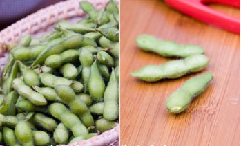 1、毛豆放在堿水里泡半小時(shí),然后用清水洗凈,剪掉兩端的尖尖口待用;