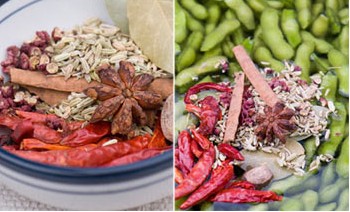 毛豆、鹽、油、干辣椒、花椒、香葉、蔥姜、小茴香、八角、桂皮。
