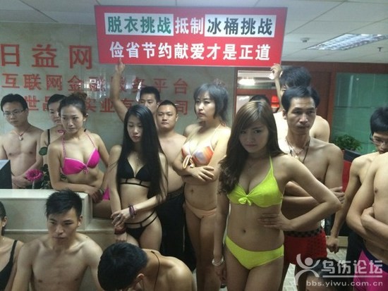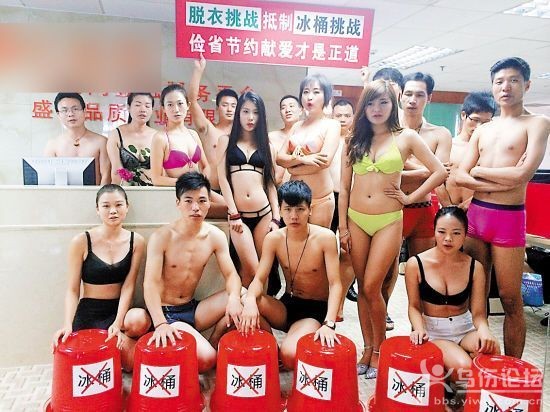 2014年8月26日,正當“冰桶挑戰(zhàn)”火遍全球之際,深圳某公司20多名年輕俊男靚女僅穿內(nèi)衣、短褲或比基尼,發(fā)起“脫衣挑戰(zhàn)”呼吁“低碳行善”。他們打出標語:“脫衣挑戰(zhàn)”抵制“冰桶挑戰(zhàn)”,儉省節(jié)約獻愛才應(yīng)大力提倡。 日前,已有極其干旱缺水的河南民眾舉空桶呼吁“請向冰桶挑戰(zhàn)說不”新聞登上各大門戶網(wǎng)站頭條,并引發(fā)節(jié)能爭議。但“冰桶挑戰(zhàn)秀”似乎越演越烈,甚至演變成商業(yè)化娛樂化的炒作。 就連萬科王石近日在鄭州舉行的亞布力論壇上回應(yīng)冰桶挑戰(zhàn)時也說:我關(guān)心漸凍人,我會捐款,但我不會做冰桶挑戰(zhàn),因為河南正在干旱,希望大家不要用娛樂方式宣傳慈善,也不要再向我發(fā)起挑戰(zhàn)。 發(fā)起該“脫衣挑戰(zhàn)”的網(wǎng)站負責人余某表示,“冰桶挑戰(zhàn)秀”能迅速讓更多人投身公益是件好事,但是拿浪費水電資源來娛樂狂歡就不妥了。所以,他們希望能以“脫衣挑戰(zhàn)”行為來抵制“冰桶挑戰(zhàn)”,呼吁愛心人士在行善的同時,莫以對人類的另一種傷害為代價。 2014年8月26日,正當“冰桶挑戰(zhàn)”成為眾明星名人的“愛心潑水節(jié)”火遍全球之際,深圳一家公司20多名年輕俊男靚女僅穿內(nèi)衣、短褲或比基尼,發(fā)起“脫衣挑戰(zhàn)倡導(dǎo)節(jié)約。 |