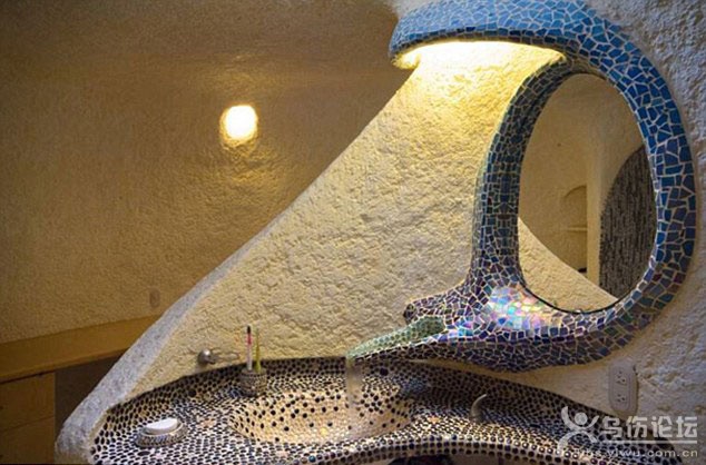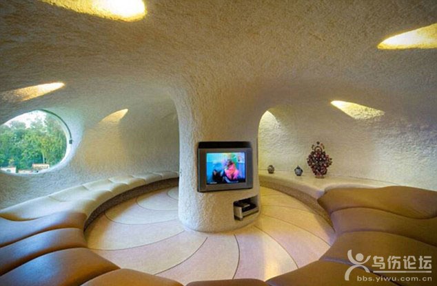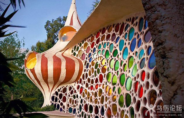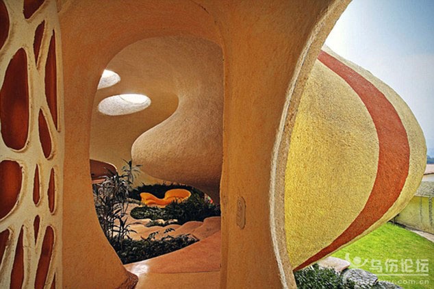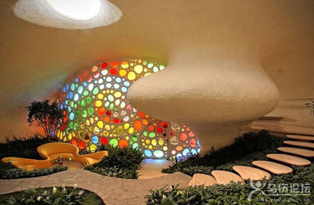 這座小屋正面光滑,有一面巨大的鑲嵌著彩色玻璃的墻,陽光透過這些玻璃進入室內(nèi),產(chǎn)生一種五彩繽紛的效果。哈維爾在建造小屋時受到了建筑師安東尼·高第(Antoni Gaudi)和弗蘭克˙勞埃德˙賴特(Frank Lloyd Wright)作品的啟發(fā),在小屋內(nèi)種植了植物,并修建了螺旋梯。 Arquitectura Organica工作室說,他們希望這座小房子能讓居住者感覺身處于蝸牛殼之中,用哈維爾的話來說,居住者感覺自己像軟體動物一樣從一個房間爬到另一個房間。 |