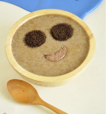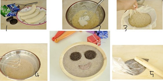 2、繼續(xù)用蛋勺打勻過濾后的香蕉糊,使之變得更加細(xì)膩,奧利奧餅片碾成末;