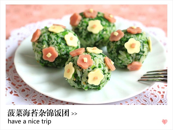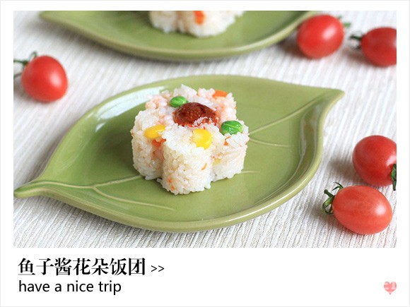 圖片來源:太平洋親子網(wǎng) 這款菠菜雜錦Q飯團五彩繽紛看著就能讓寶寶流口水了,里面的菠菜含有豐富的維生素C、胡蘿卜素、蛋白質(zhì),以及鐵、鈣、磷等礦物質(zhì),可以滿足寶寶發(fā)育需求。 主要材料:米飯、菠菜、胡蘿卜、海苔、雞蛋、芝麻、香油、鹽 魚子醬花朵飯團 如果還嫌上面的菠菜飯團不夠養(yǎng)眼,下面這款花朵飯團估計可以為寶寶的旅途增色不少。