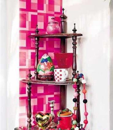 粉紅色幾何圖案裝飾紙,讓原本只是四白落地的墻面和孤零零的置物架鮮活起來(lái)。