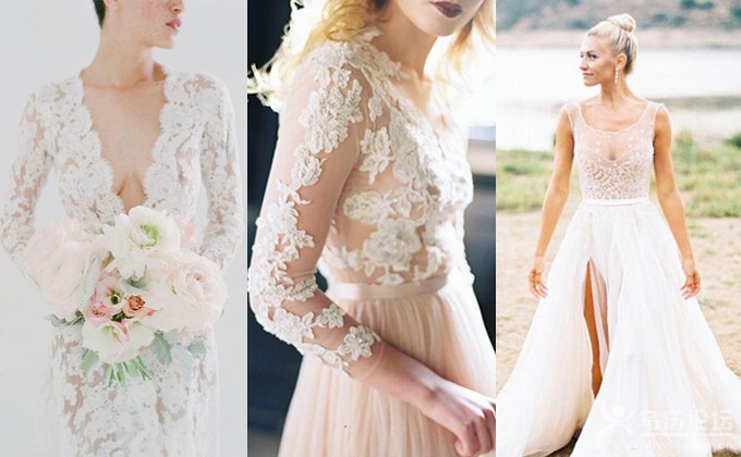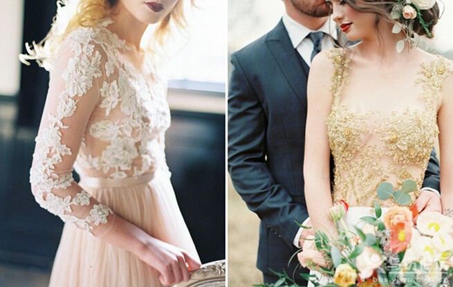 : 若隱若現(xiàn)的裸透蕾絲婚紗,是近年來不可忽視的婚禮潮流。