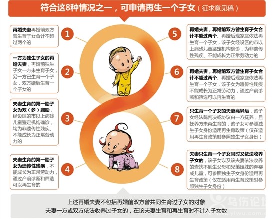 ![]() 浙江在線05月14日訊 (錢江晚報記者 丁潁鵑/文 梁津銘/繪) “父母領(lǐng)養(yǎng)了一個妹妹,我能算‘獨生子女’嗎,我可以生兩個寶寶嗎?” “我是離異的,但孩子判給了對方,我再婚后可以再生個寶寶嗎?”…… 這些關(guān)于我省單獨二胎再生育的疑問,馬上就有新解答了——近日,浙江省衛(wèi)計委在其官網(wǎng)上發(fā)布了《浙江省特殊情況再生育規(guī)定(征求意見稿)》,向社會公開征求意見。 這次再生育相關(guān)的征求意見稿,是之前網(wǎng)上盛傳的二胎政策要放開了嗎? 昨日國家衛(wèi)計委就《中國家庭發(fā)展報告(2015年)》舉行新聞發(fā)布會,在被記者問及二胎政策有何進展時,新聞發(fā)言人宋樹立作出回應(yīng),表示網(wǎng)上相關(guān)消息傳言不屬實。 宋樹立表示,因為中國人口眾多,人口對于資源、環(huán)境,對于經(jīng)濟社會發(fā)展的壓力是長期存在的。但他特別表示,“單獨二孩不是句號,要往下走,要促進人口的長期均衡地發(fā)展,加強政策的實施評估,加強人口形勢的研判。” 此次我省出臺“征求意見稿”,其框架依然是在國家單獨二孩原有的總體原則之下。但我省在具體落實時,將比之前更細(xì)化。 比如這份征求意見稿,對8種特殊情況進行了修改,分別針對再婚夫婦、病殘兒以及獨生子女,其中針對獨生子女的說明,對一些很多被排除在“單獨二胎”政策之外的家庭來說,是個好消息。 杭州的王先生,有一個妹妹,是領(lǐng)養(yǎng)的,而他本人是父母生育的唯一一個孩子。去年單獨二胎政策出臺后,王先生全家都很想去申請再生一個,但卻被告知自己不能算“單獨“,如果非要生,只能讓妹妹和父母解除領(lǐng)養(yǎng)關(guān)系,但這是王先生不能接受的。 錢報記者看到,浙江省衛(wèi)計委剛發(fā)布的這份征求意見稿,對“獨生子女”的條件新增了3個條款,其中一條就是針對王先生這樣的情況,也就是王先生可以再生育一個孩子。 征求意見稿還對其他再生育的特殊情況做了說明,其中有不少屬于新增的條款。 比如,針對再婚夫婦,取消了當(dāng)前家庭子女?dāng)?shù)1個的限制,改為“再婚夫妻在婚前雙方曾生育子女合計不超過兩個的”,也可以申請再生育。 這份文件,目前在浙江省衛(wèi)計委網(wǎng)站上公開征求意見的期限為5月12日~18日,反饋意見可以在5月18日之前,通過電子郵件發(fā)送到zdc_gkzqyj@163.com。 |