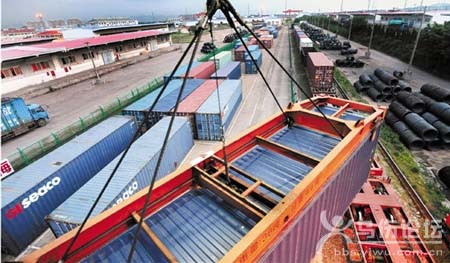 6月1日,義烏鐵路西站,工作人員正在往一列火車上裝運出口集裝箱。自“義烏-寧波北侖港”鐵海聯運業(yè)務開通以來,義烏成了“始發(fā)港”。據義烏海關統計,至5月31日共監(jiān)管該線鐵海聯運集裝箱1884標箱,同比增長329%。