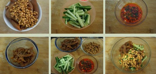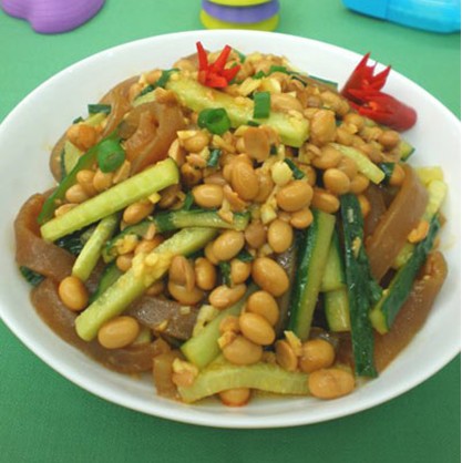 原料:豬皮250克、黃豆50克(提前3小時左右用水泡發(fā))、青瓜100克、八角、桂皮、香葉、花椒、干辣椒、生姜3片、料酒、老抽、芝麻油、生抽、醋、辣椒油、生姜、大蒜、蔥適量。 做法: 1、豬皮洗凈后放入沸水中煮3分鐘左右,撈出放入涼水中,用夾子夾去殘留的豬毛,用刀子剔去零星的肥肉,再將肉皮的兩面都刮干凈后將其切成巴掌大小的塊; 2、將調(diào)料1洗凈(料酒、老抽除外)放入高壓鍋內(nèi),再將泡好的黃豆洗凈,與處理好的豬皮一起放入高壓鍋內(nèi),加入適量的鹽,少許料酒、老抽,再加入兩碗水(水要浸過豬皮),扣上鍋蓋,大火燒開后轉(zhuǎn)小火煮十五分鐘后關(guān)火,等一至兩小時后再將豬皮與黃豆撈出; 3、大蒜與生姜切成末,蔥切成花,將它們放入小碗中,加入適量的鹽,少許芝麻油、醋、生抽、辣椒油拌勻后靜置十分鐘左右; 4、青瓜洗凈后切成粗絲,冷卻的豬皮切成與青瓜差不多大小的絲,將它們與黃豆一起放入碗中,倒入調(diào)好的醬汁拌勻即可。