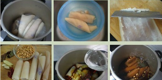 經(jīng)驗分享: 1、將豬皮放入沸水中煮一會兒是為了便于將豬毛清理干凈,煮過之后的肉皮比較硬,上面殘留的豬毛就很容易發(fā)現(xiàn)了; 2、香料可用紗布將其包好,如果直接放就得像我一樣等煮好了再將它們一樣樣地?fù)斐鰜恚?/FONT> 3、煮好的豬皮等一至兩小時后再取出是為了讓其泡在湯汁里更好地入味。