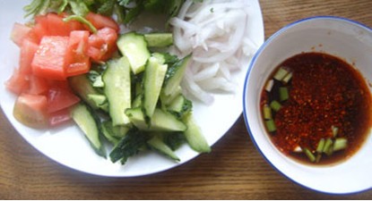 1、將黃瓜切片、西紅柿切塊、青椒切絲、香菜切成一節(jié)一節(jié)、洋蔥切絲、蒜苗切粒;