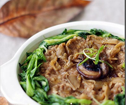 上道超級快捷的煲仔飯,米飯、肉、菜一鍋出,是職場主婦搞定家人腸胃的好武器。試試吧,只用20分鐘,一切搞定。 原料: 大米200克、水適量、肉餡150克、去皮馬蹄4個、榨菜絲30克、姜一片、蒸魚豉油1大匙、油1大匙、生粉1大匙、青菜適量、鹽、生抽適量。 做法: 1、米淘洗干凈后,放入通常做法的鍋中,按照1:1的比例加入水。然后倒入砂煲中。 2、砂煲放入微波爐,用一根筷子撐住鍋蓋,砂鍋底下放個盤子接溢出的米湯,800瓦微波高火煮6分鐘,至米飯凝結(jié)基本無水分。 3、趁煮飯功夫,用生抽和鹽將肉餡碼味,并加入適當(dāng)?shù)乃,順一個方向攪打上勁。 4、馬蹄和姜切碎,放入肉餡中拌勻,并加入生粉,再次拌勻。同時抓住肉餅不斷摔打,直到肉和菜成團不分開。 5、煮好的米飯取出,將油澆于米飯壁邊,并均勻鋪上肉餅,撒上榨菜絲,蓋上蓋子,高火7分鐘。 6、另在灶火上起煮鍋,加入水煮沸,放入青菜燙熟,瀝干水待用。 7、米飯煮好后燜8分鐘后,取出,鋪上青菜,撒上蒸魚豉油即可上桌。