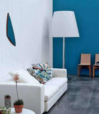 試著將一面墻壁漆成柔和的藍(lán)色,在另一面白色墻壁上點(diǎn)綴不規(guī)則的呼應(yīng)色,再加上藍(lán)色元素的印花靠墊,搭配白色的沙發(fā),這樣的氛圍,同樣可以營造出安靜柔和的夏意。