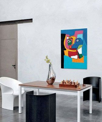 一幅波普風(fēng)格的裝飾畫,不同層次的藍(lán)與強(qiáng)烈的對(duì)比色形成的風(fēng)趣與熱烈,同樣可以將藍(lán)色詮釋出別樣風(fēng)情。黑與白造型獨(dú)特的餐椅,加上餐桌上一株簡(jiǎn)潔卻可以柔化居室風(fēng)格的植物,夏天的氣氛在不知不覺中無限生發(fā)。