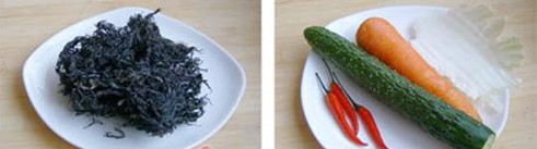 原料:紫晶藻、白菜、胡蘿卜、黃瓜、小紅椒、辣椒油、醋、香油、生抽、味精、糖。