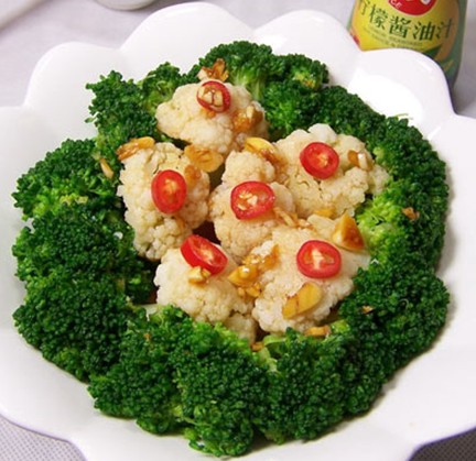 原料:西蘭花、菜花、紅椒、大蒜。 調(diào)料:勺氏檸檬醬油汁、鹽、香油。 做法: 1、將西蘭花和菜花分別掰成小塊,在鹽水里浸泡10分鐘,清洗干凈。 2、鍋中入水燒開,加入一滴油,將西蘭花和菜花放入開水中快速焯燙撈起。 3、放在涼開水盆里過(guò)涼撈起后,控干水分裝盤。 4、將蒜切成末,調(diào)入勺氏檸檬醬油汁、鹽、香油攪拌均勻,做成調(diào)味汁兒。 5、將紅椒切成圈,放在菜花上面做點(diǎn)綴,調(diào)味汁兒倒在西蘭花和菜花上拌勻即可。