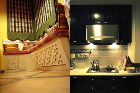 亮點三:餐廳卡座特寫:工人師傅雕琢出來簡單雕花增添了藝術(shù)氣息,業(yè)主自己挑選的條紋靠墊則舒適溫馨。有別于餐廳的溫馨,廚房顯得比較酷,黑色的靜謐。 |