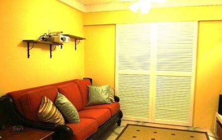 亮點一:客廳和餐廳呈手槍狀,墻面以米黃色為主。地面鋪的是地磚,斜向的大方塊并黃綠兩色相拼,自然而古樸?蛷d百葉門的后面其實是一個房間,有意思吧。