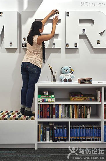 設(shè)計(jì)重點(diǎn):裝飾生活墻 編輯點(diǎn)評(píng):“TEACH FOR AMERICA”字母懸掛于墻,在此字母上貼上教師與學(xué)生的教育場(chǎng)景照片,使其富有生活氣息。