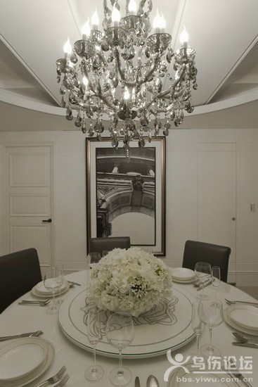 設(shè)計重點:奢美水晶燈 編輯點評:位居空間中央核心的餐廳,設(shè)計師以奢美水晶燈烘托華美大器于極致。
