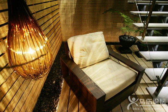 設(shè)計(jì)重點(diǎn):造景 編輯點(diǎn)評(píng):木質(zhì)環(huán)繞的梯下空間,擺上一張舒適的座椅即成渡假景致。