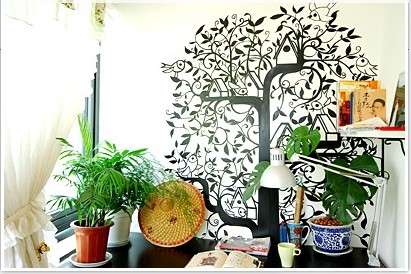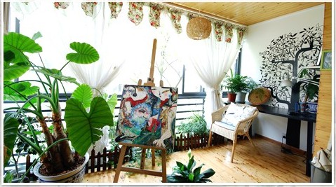 巨大的手繪樹VS沿欄桿的花花綠植,營(yíng)造出了陽(yáng)臺(tái)上的盎然生機(jī)。