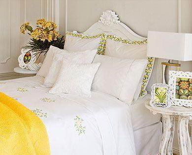 金黃色的毯子仿佛陽(yáng)光般傾瀉在床上,潔白的床品上,幾叢淡淡的黃綠色小碎花若隱若現(xiàn)。黃綠色碎花的花環(huán)圍繞在兩個(gè)大靠枕上,再加上幾個(gè)純白色抱枕,讓優(yōu)雅清新的感覺(jué)更加突出。