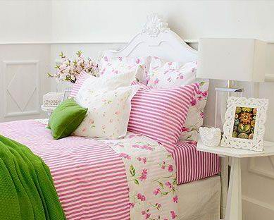 條紋和碎花翻了個順序,立刻就顯得淡雅優(yōu)美,再配上純綠色實地小抱枕和綠色毯子,就像花叢中的一抹嫩芽,清新脫俗。