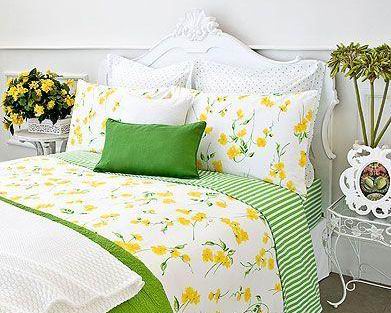黃色鳶尾爛漫的綻放在潔白的床品上,翻出的綠色條紋就像一條絲帶將繽紛的碎花攏成一束。綠色的抱枕和毯子增添了清新的氣息,將一派明媚的景象融入臥室。