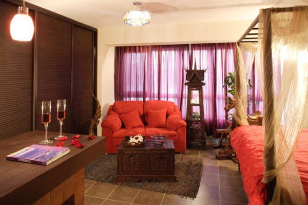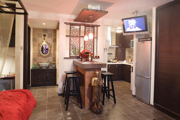 設(shè)計(jì)與以往的設(shè)計(jì)程序上有所不同.可謂是常規(guī)與逆向的結(jié)合,其中的逆向是同為房主在泰國(guó)生活的部分積累,床、木馬、佛像……都是房主希望在這次設(shè)計(jì)當(dāng)中充分利用并得以切合搭配的配飾品,這作為設(shè)計(jì)師來講的我便要逆向反位思考,在怎樣的空間與風(fēng)格色調(diào),才是其最切合的環(huán)境。 由此大色調(diào)與風(fēng)格也已其本定位。 其次,是細(xì)節(jié)的修飾,空間的兼用,又如處理空間的手法給予人的心理感受,也是設(shè)計(jì)師充分把握的。 入門玄關(guān)處,空間狹小,給予隱藏更衣柜鏡子飾面,即滿足功能的同時(shí),也解決了狹小空間給人的擁擠感。 外置水盆,吧臺(tái)專門定制的吧椅,更是在有效利用的同時(shí)賦予空間風(fēng)格以靈性。