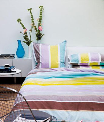 圖為 現(xiàn)代簡(jiǎn)約白色格調(diào)床具 打造輕松活潑臥室 淡紫色與水藍(lán)色過(guò)渡的主調(diào)彩色條紋裝飾,使得床品整體簡(jiǎn)潔而具動(dòng)感。淡淡的色澤更迎合了春的清爽,大膽而不張揚(yáng),時(shí)尚而不傲氣。與簡(jiǎn)約的白色床頭及空間搭配和諧。配上清涼金屬條靠背椅及現(xiàn)代家具,擺放上設(shè)計(jì)感十足的花瓶裝飾,完美地打造出輕松休閑的臥室一角。