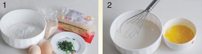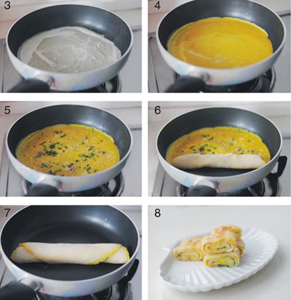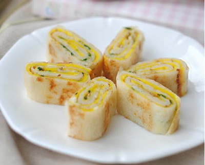 原料:面粉、淀粉、水、鹽、雞蛋、蔥、芝麻、肉松、油。 做法: 1、材料:面粉、淀粉、水、鹽、雞蛋、蔥、芝麻、肉松、油; 2、將面粉、水、淀粉、鹽、適量色拉油混合,攪拌均勻至無面粉顆粒狀(用量根據(jù)個(gè)人需要調(diào)節(jié)。面糊的稠度也可以根據(jù)個(gè)人口味調(diào)節(jié)); 3、平底鍋倒少許油,然后倒入面糊,轉(zhuǎn)動(dòng)鍋或用勺子攤成面皮; 4、面皮凝固后,將雞蛋液覆蓋在面皮上,晃動(dòng)鍋或借助勺子將蛋液鋪均勻; 5、撒蔥花、芝麻和肉松(我拍照的這個(gè)餅做忘了加肉松了); 6、待蛋液即將凝固的時(shí)候?qū)灳砥,一定要在蛋液還沒完全凝固的時(shí)候卷起,這樣才能裹得成型; 7-8、卷起后小火再煎一下,待蛋卷上色成金黃即可切塊裝盤。