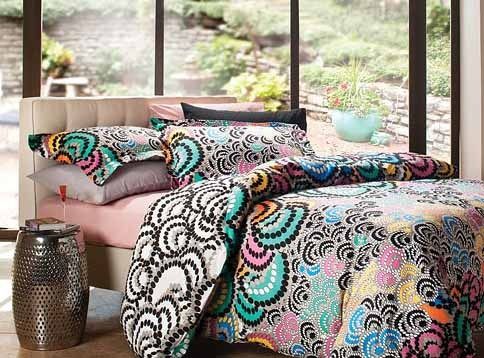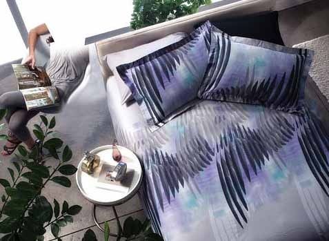 以黑色羽毛為設(shè)計元素,少許的藍色和紫色,點綴在銀灰的底色上,色與色之間相互映襯融合,讓款式簡潔的床品有著豐富的層次與漸變。如潑墨般大氣的圖紋,隨性而不乏精致神韻。